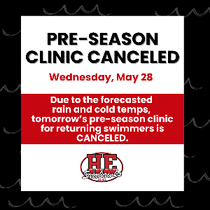 Due to the chilly and rainy forecast for tomorrow, we're canceling Wednesday’s pre-season clinic. We’ll pick things up as planned on Thursday. Can’t wait to see everyone then! Reminder: This clinic is just for returning HEST swimmers. If you have any questions, feel free to reach out.