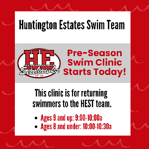 HEST Swimmers... today's the start of the pre-season swim clinic! Reminder that this clinic is for returning swimmers and not for new members of the team (even if they have been on another swim team in past years). The new swimmer testing is next week on June 3 followed by an ice cream social for the entire team!